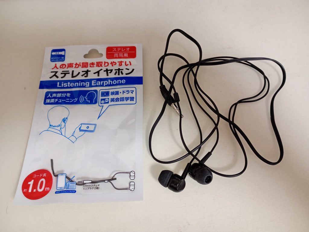 あと、全く話が変わるのですが、今回、ヘッドホンを持って行くのを忘れてしまって、町田市で入手したセリアの、イヤホンです。